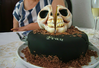 Es la primera que hago en 3D, esculpiendo la calavera en el bizcocho con un cuchillo, y luego cubierta de fondant. Me ha gustado la experiencia...creo que esto puede tener muchas posibilidades.